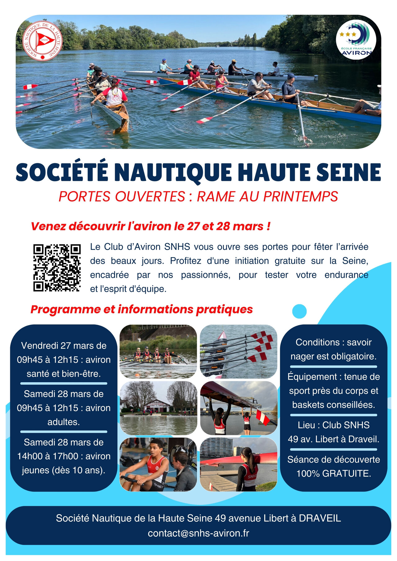 Le club d'aviron SNHS organise l'opération “Rame au Printemps”. Cet événement propose des initiations gratuites à l'aviron pour les habitants du territoire.