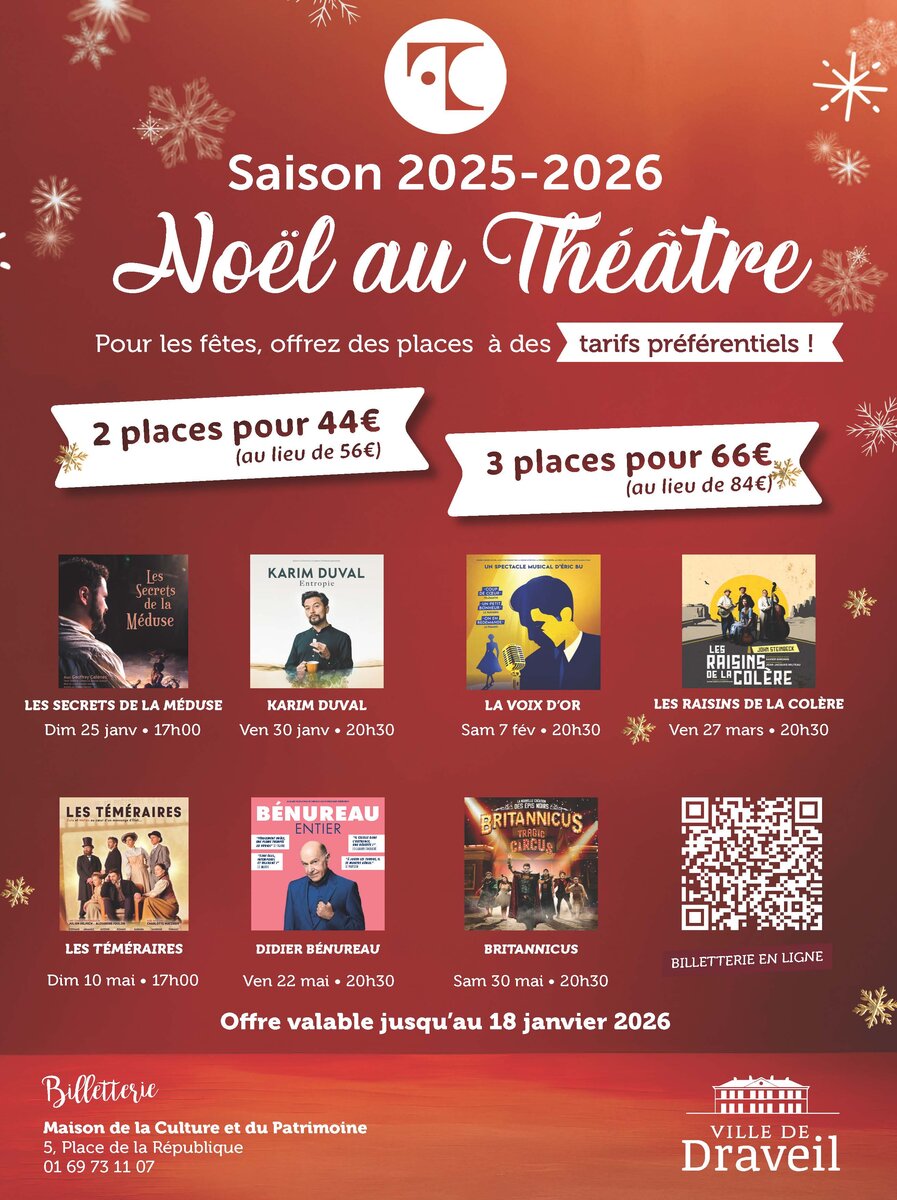 Pour les fêtes, offrez un cadeau original et culturel à vos proches. La Ville de Draveil et le Théâtre D.Cardwell vous proposent des tarifs préférentiels pour plusieurs spectacles de la Saison 2025/2026.